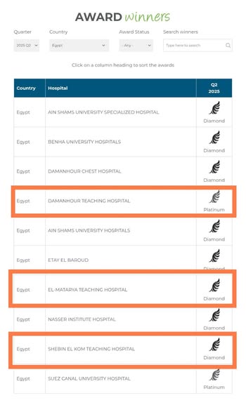 حصول مستشفيات المطرية التعليمي وشبين الكوم التعليمي على (المستوى الماسي) كأعلى مستوي لمقدم الخدمة العلاجية لمرضى السكتة الدماغية، وحصول مستشفى دمنهور التعليمي على (الجائزة البلاتينية )